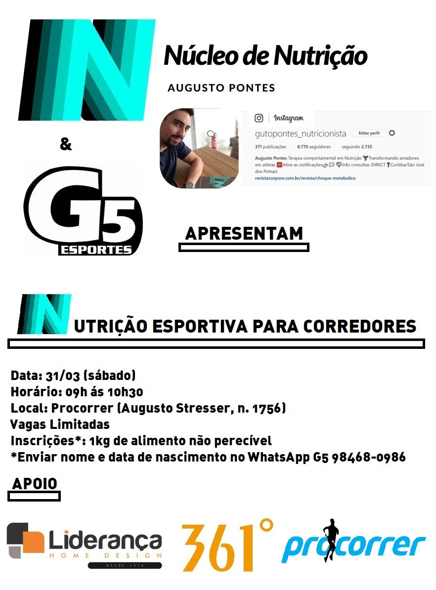 No dia 31/mar, sábado, iremos organizar na Procorrer uma palestra sobre nutrição com fala do nosso parceiro o nutricionista Augusto Pontes. O evento será das 9h as 10h30 e a inscrição é 1kg de alimento não perecível. Veja o informativo e confirme sua presença.